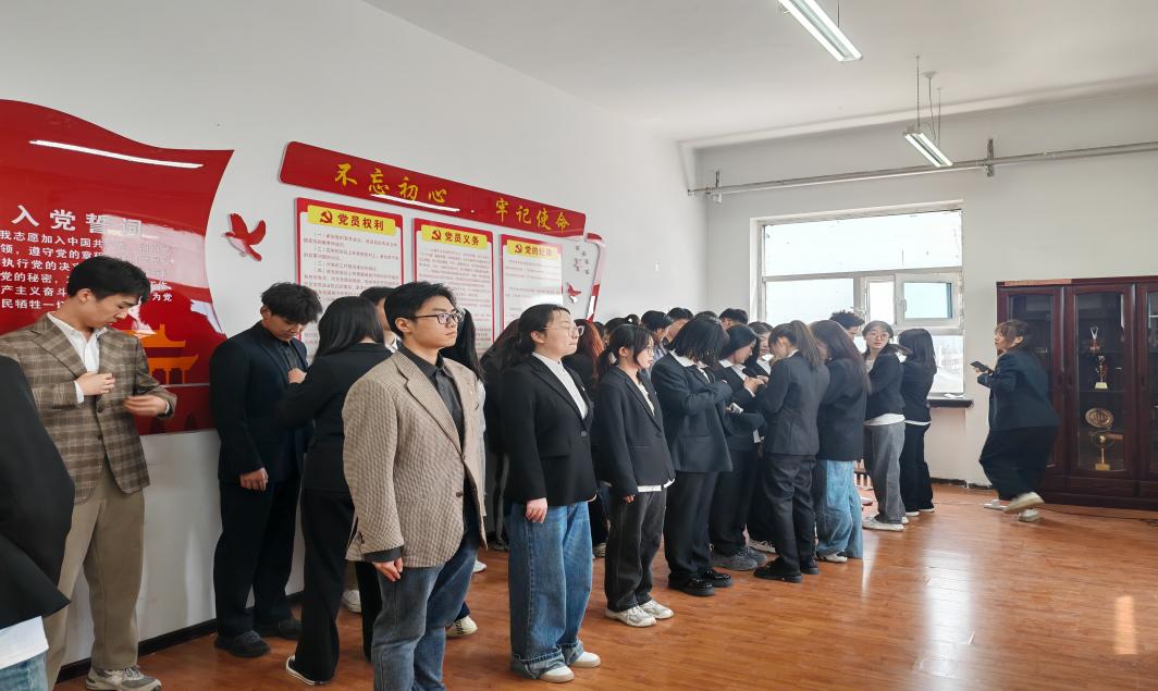 仪式第二项,张博伦书记宣读了新团员名单,随后,老团员代表为新团员们佩戴上了闪耀的团徽,这枚小小的团徽承载着责任与使命,传递着共青团的光荣传统;