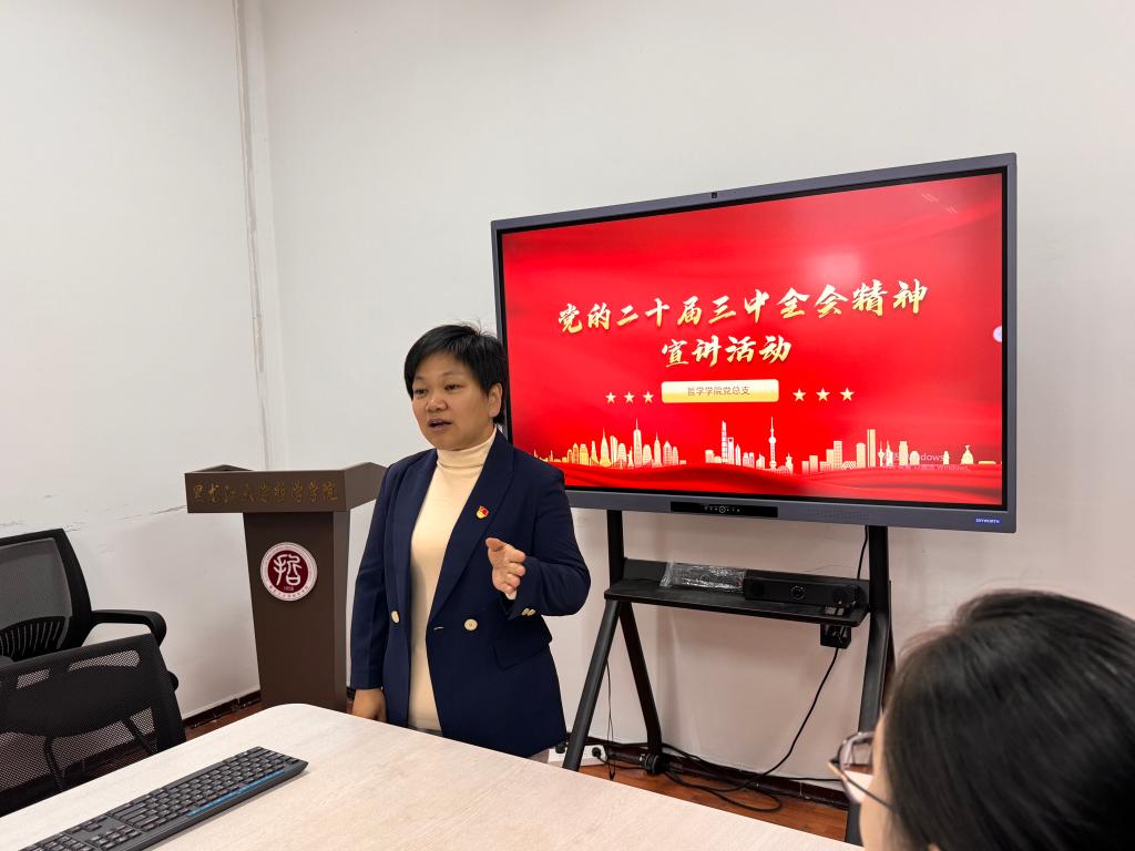 10月14日,学生党支部书记赵慧雪于汇文楼921以《领悟党的二十届三中全会精神 勇担改革新使命》为题进行宣讲,她指出学生党员作为青年学生中的先进分子,要刻苦钻研不断提升自己的专业素养,发挥模范带头作用,为强校发展贡献“哲漾”学子的力量。