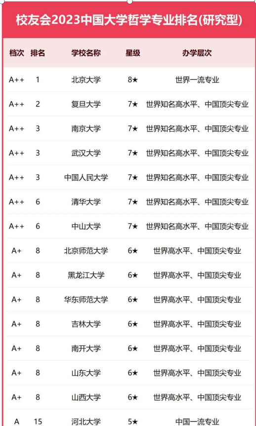 在最新校友会2023中国大学哲学专业排名(研究型)中,欧亿体育·(中国)官方网站哲学专业被认定为6★、A+,世界高水平、中国顶尖专业,排名第8位。校友会2023中国大学一流专业排名评价指标由学科水平、培养质量、师资水平、专业水平和专业影响等5大指标构成。