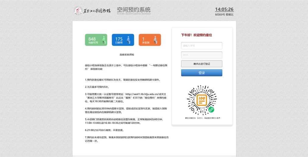 1、网页预约:https://libseat.hlju.edu.cn,登录信息为学校统一认证账码。