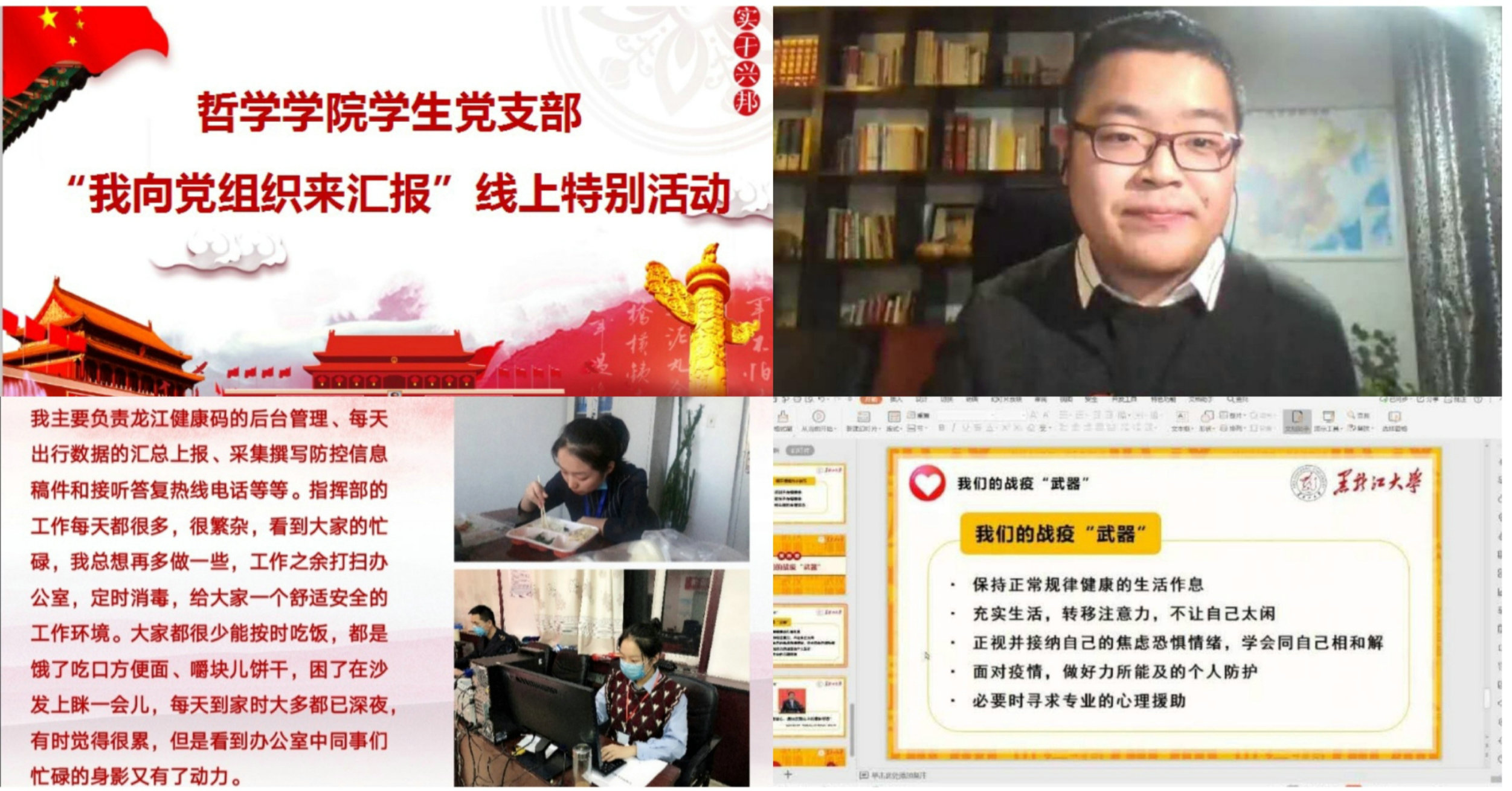 为进一步做好疫情防控期间的学生党员思想引导工作,按照“抗‘疫’进行时,组织生活不断线,学生党员教育管理不放松”的要求,哲学学院结合学生党员实际和工作重点,于2020年3月13日举办了学生党员“我向党组织来汇报”线上特别活动。活动紧紧围绕“引导学生党员充分发挥先锋模范作用,用实际行动为党旗增辉、为党徽添彩,让党旗在防控疫情斗争中高高飘扬”的主旨内容开展。学生党员代表分别从“投身疫情防控一线志愿服务、线上学习经验与方法分享、居家学习生活节奏及心理调试、融入学院线上文体活动心得分享”等方面,结合自身实际与经历感悟,与学院全体学生党员进行深入交流。大家相互学习,汲取经验,共同提高。学生党员真切表达出在特殊时期的庄重承诺,体现出严以律己的责任担当,彰显出“抗击疫情,义不容辞”的青年榜样力量!努力发挥自身作用,坚定战胜疫情信心,以实际行动传递正能量,为打赢战“疫”阻击战贡献出应有之力。